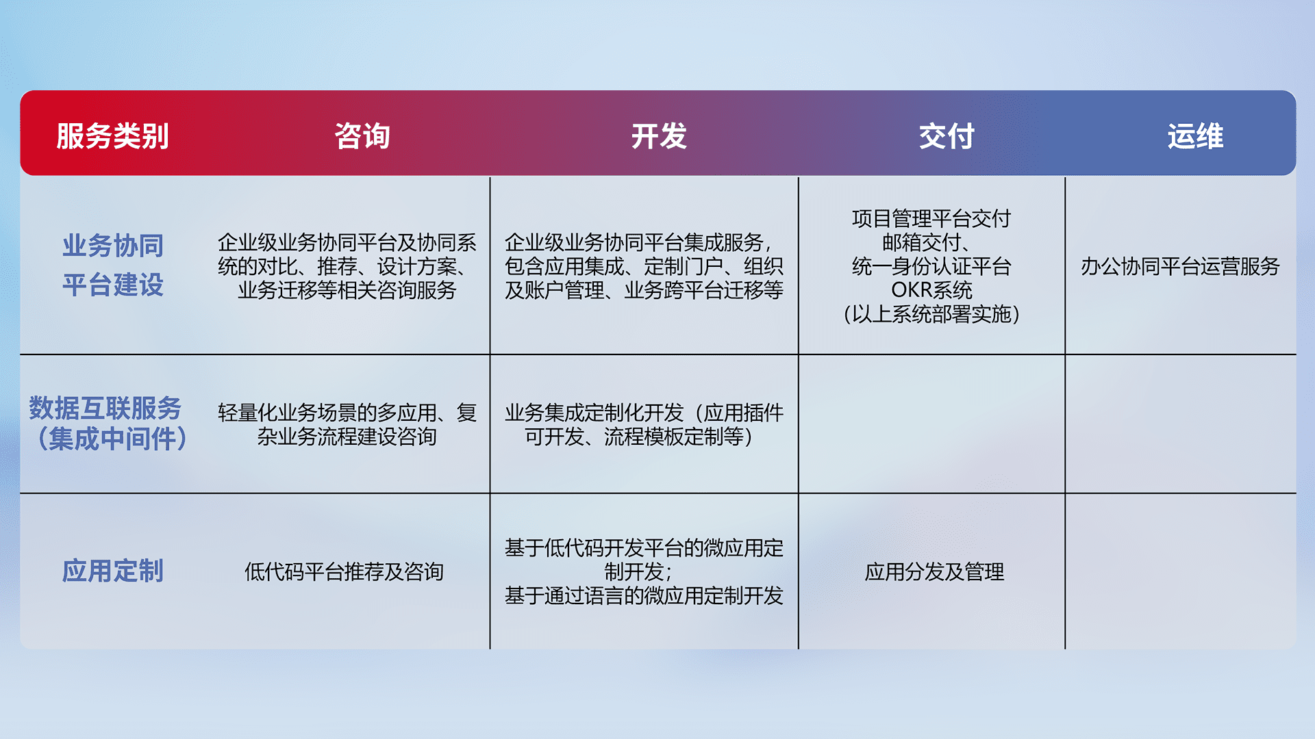 针对钉钉、、、、企微、、、、IDaas等平台级产品提供产品的规划、、、方案、、交付、、定制化开发等服务,,实现如统一协同办公、、、、智能客户服务、、、混合会议管理、、、、智能数据查询、、、等业务场景,,,实现数字化转型。。。。