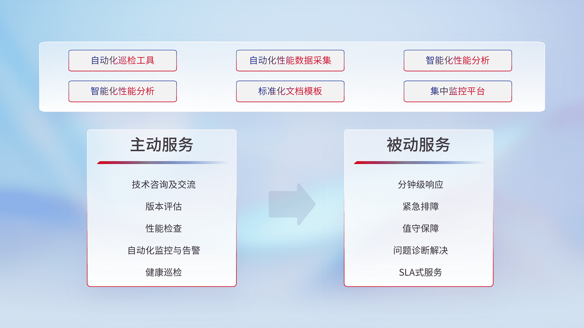 智能化工具和标准化文档,,保障服务质量,,,,提供主动服务(包含技术咨询、、、版本评估、、、、性能检查、、、、自动化监控与告警、、、、健康巡检)和被动服务包含(分钟级响应、、、、紧急排障、、、、值守保障、、、、问题诊断解决、、、、SLA服务)。。